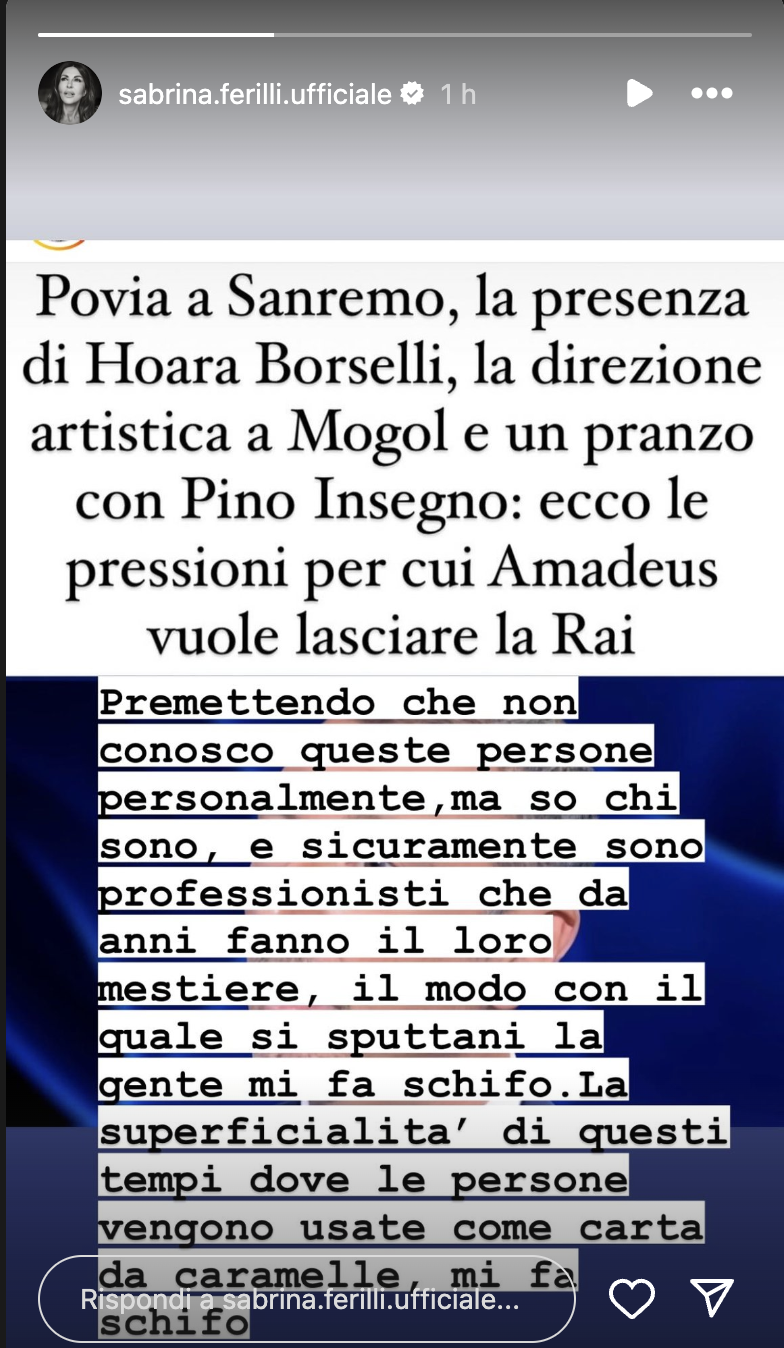L’aver coinvolto altre persone, però, ha infastidito Sabrina Ferilli che in una stories pubblicata sul suo profilo Instagram ha scritto: “”Premettendo che non conosco queste persone personalmente, ma so chi sono e sicuramente sono professionisti che da anni fanno il loro mestiere, il modo con il quale si sputtani la gente mi fa schifo”.