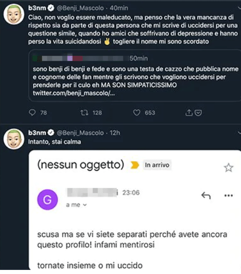 Benji Mascolo, l’ex componente del duo, ha condiviso il messaggio sui suoi canali social, dimenticando di oscurare nome e cognome della ragazza e forse sottovalutando anche la gravità della situazione. La reazione degli altri fan è stata immediata, in molti hanno criticato la scelta di non oscurare i dati della ragazza, ma Benji ha risposto spiegando: “Non voglio essere maleducato, ma penso che la vera mancanza di rispetto sia da parte di questa persona che mi scrive di uccidersi per una questione simile, quando ho amici che soffrivano di depressione e hanno perso la vita suicidandosi. Togliere il nome mi sono scordato”.