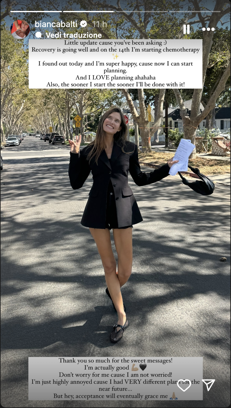 In una stories pubblicata sul suo profilo Instagram, infatti, la modella ha scritto: “Piccolo aggiornamento visto che state chiedendo. La convalescenza sta andando bene e il 14 inizierò la chemioterapia. L’ho saputo oggi e sono super felice perché ora posso iniziare a fare progetti. E i adoro fare progetti. Inoltre, prima inizio e prima avrò finito”.