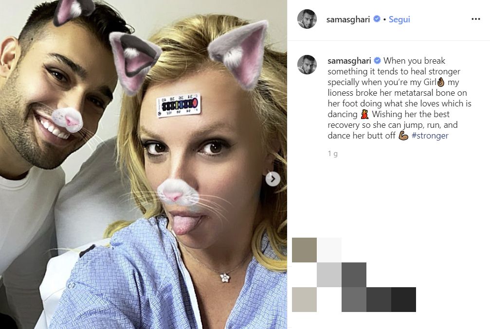 Il fidanzato di Britney ha allegato anche un video, dove mostra il gesso che fascia il piede della cantante, con su inciso una sola parola: “Stronger”, come una delle celebre hit di Britney.