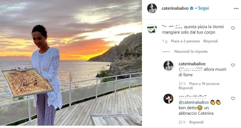 La foto ha raccolto subito migliaia di like e molti commenti. Tra questi uno provocatoriamente hot di un follower che ha scritto: “Questa pizza la vorrei mangiare solo dal tuo corpo”. La conduttrice ha quindi risposto piccata: “Allora muori di fame”. Parole forti che hanno però trovato l’apprezzamento di molti e molte fan, che si sono schierati dalla parte di Caterina Balivo: “Brava cate… quanti idioti e ignoranti in questo mondo”.
