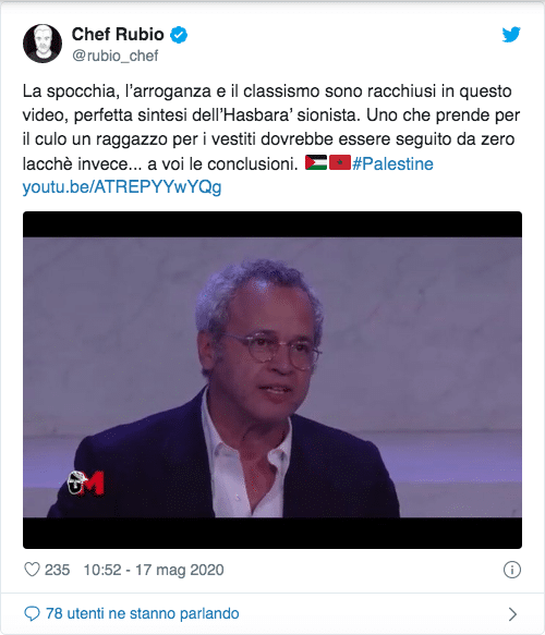 “Peccato per quel filo israeliano”: Chef Rubio contro Mahmood. E nella polemica interviene anche Gemitaiz 2. Chef Rubio commenta il ritorno di Silvia Romano e attacca Erdogan. Polemica sui social 3. Chef Rubio attacca le sardine: “La lotta sociale non sono loro” 4. La comunità ebraica di Roma querela Chef Rubio: “Istiga all’odio antisemita e minimizza la Shoah”