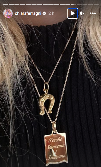 Così, tra i lavoretti dei suoi bimbi di Leone e Vittoria che con dolci disegni hanno augurato alla mamma, la migliore fortuna, un beauty per portarsi dietro il suo survival kit regalatole dagli amici stretti, un blocchetto con su il suo volto da ansia sanremese per buttare giù i pensieri su questa esperienza e tante pietre porta fortuna, Chiara sembra pronta ad affrontare al meglio questo debutto televisivo. E tra i tanti oggetti superstiziosi che si è portata dietro ce n’è qualcuno che spunta all’occhio più di tutti, una collanina con un ferro di cavallo e poi un ciondolo con su scritto “Sanremo è Sanremo” l’iconica frase identificativa dello show.