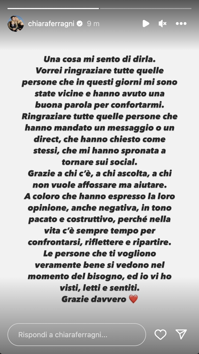 Nella seconda, invece, l’influencer ha scritto un messaggio per tutti i suoi follower. “Una cosa mi sento di dirla – ha scritto Chiara Ferragni – Vorrei ringraziare tutte quelle persone che in questi giorni mi sono state vicine e hanno avuto una buona parola per confortarmi”.