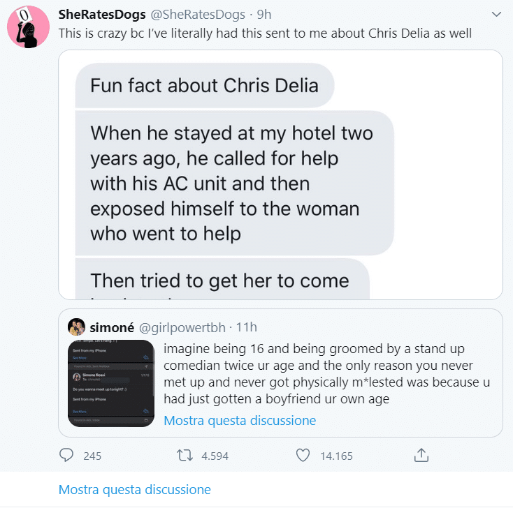 “Immagina di avere 16 anni e di essere adescata da un comico che ha il doppio della tua età e l’unica ragione per cui non vi siete mai incontrati e non hai subito molestie fisiche è perché hai già un ragazzo della tua età”. Il tweet della ragazza è diventato virale, tante altre donne hanno deciso di farsi avanti sostenendo le accuse nei confronti dell’attore. Un’altra donna ha twittato: “È spazzatura” riferendosi a Chris D’Elia. “Mi ha inserito nella lista di un locale per poter vedere una sua esibizione dal vivo e ha detto che avrei potuto raggiungerlo nella sua macchina dietro l’edificio, proponendomi sesso orale. Ho inventato una scusa e non mi sono presentata”.