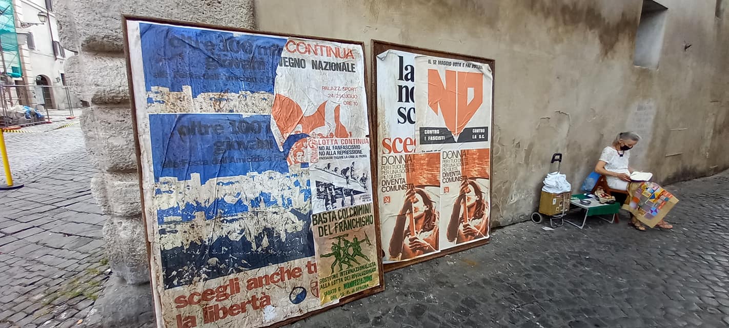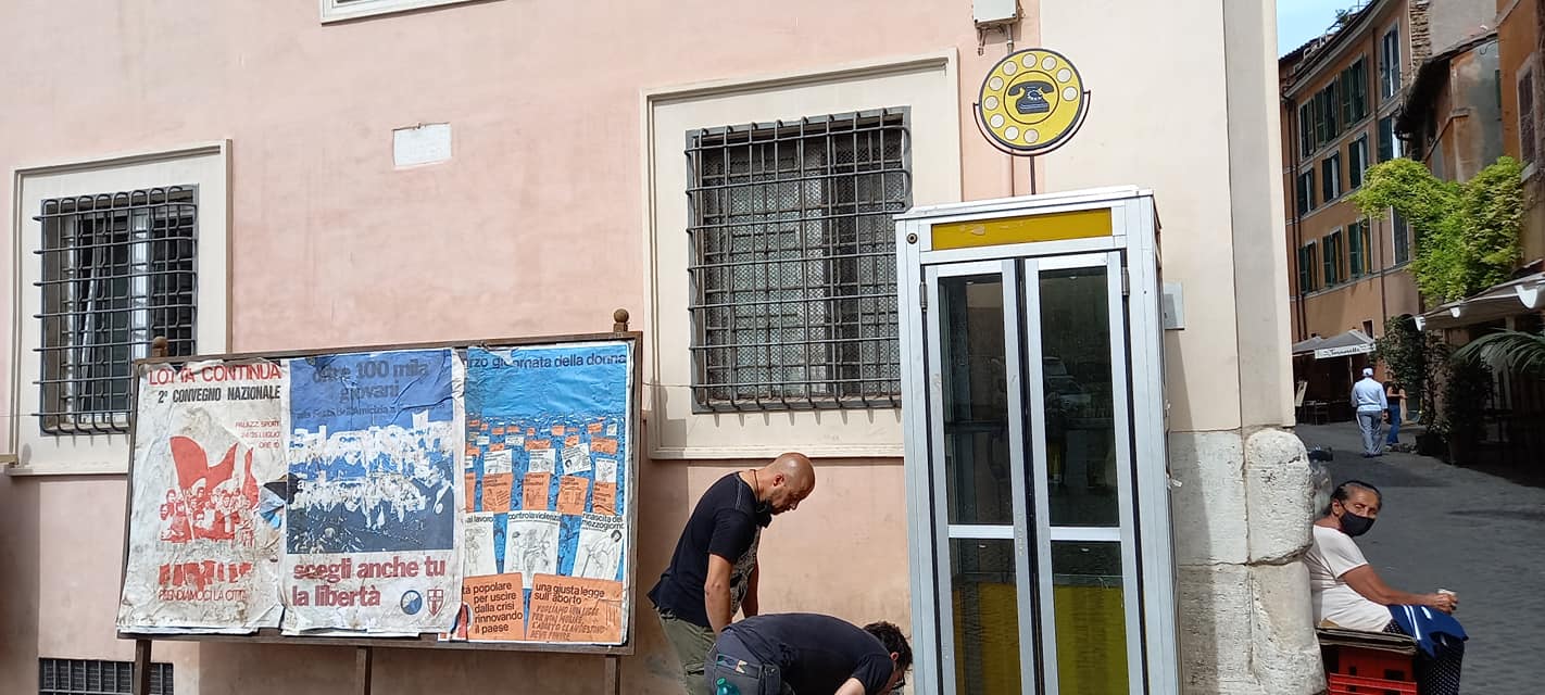 La mattina del 24 giugno i residenti e i turisti che si sono affacciati in piazza Santa Maria in Trastevere l’hanno trovata stravolta: una cabina telefonica gialla, di quelle in uso fino ai primissimi anni Ottanta, il cartello della stazione Taxi (oggi le auto non possono accedere alla piazza), i manifesti elettorali del PCI e di Lotta Continua, mentre un bar è stato completamente ri-arredato e una gelateria addirittura ricostruita.