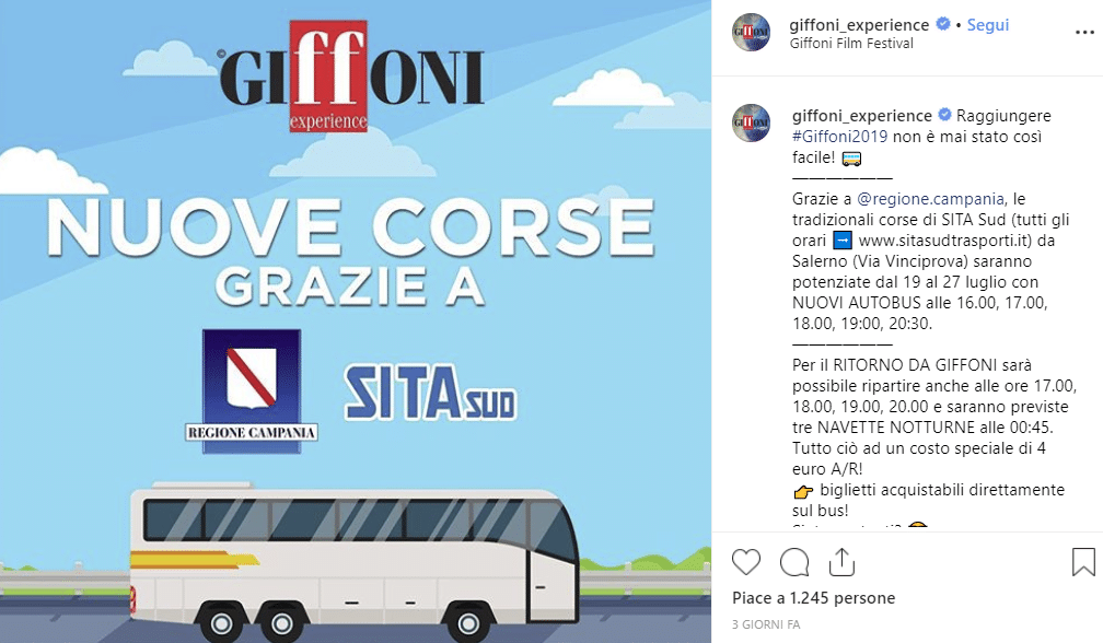 Chi viaggia in treno, dovrà arrivare alla stazione ferroviaria di Salerno e da lì scegliere un treno regionale. Chi invece viaggia in autobus può consultare questo sito segnalato dall’organizzazione del festival dove sono presenti gli autobus che partono da Salerno e arrivano a Giffoni Valle Piana.