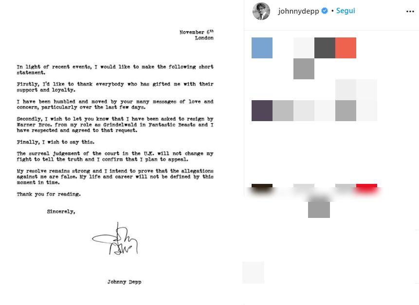 Johnny Depp da anni ormai è coinvolto in una brutta separazione con l’ex moglie Amber Head, a sua volta attrice che l’ha accusato di violenza domestica, accuse che Depp non soltanto ha negato ma che a sua volta ha rivolto alla moglie. Riguardo la sentenza, Depp ha aggiunto: “Infine, vorrei dire questo. Il surreale giudizio della corte britannica non cambierà la mia voglia di dire la verità e confermo che sto pianificando di presentare appello contro la sentenza. La mia determinazione rimane forte e intendo provare che queste accuse nei miei confronti sono infondate. La mia vita e la mia carriera non saranno definite da questo momento”.