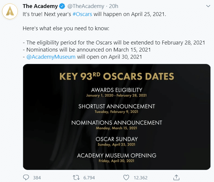 La notte degli Oscar 2021 non si svolgerà più a febbraio, come da tradizione, ma slitterà ad aprile, precisamente il 25. La data prevista inizialmente era il 28 febbraio ma, causa Coronavirus e tutti i disagi che la pandemia ha provocato, la 93esima edizione degli Oscar è stata ricollocata ad aprile. A dare l’annuncio è stato il Board of Governors dell’Academy of Motion Picture Arts and Sciences. Oltre alla data, cambia anche il regolamento: di fatto è stata estesa la finestra di eleggibilità che passa dal 31 dicembre 2020 al 28 febbraio 2021.
