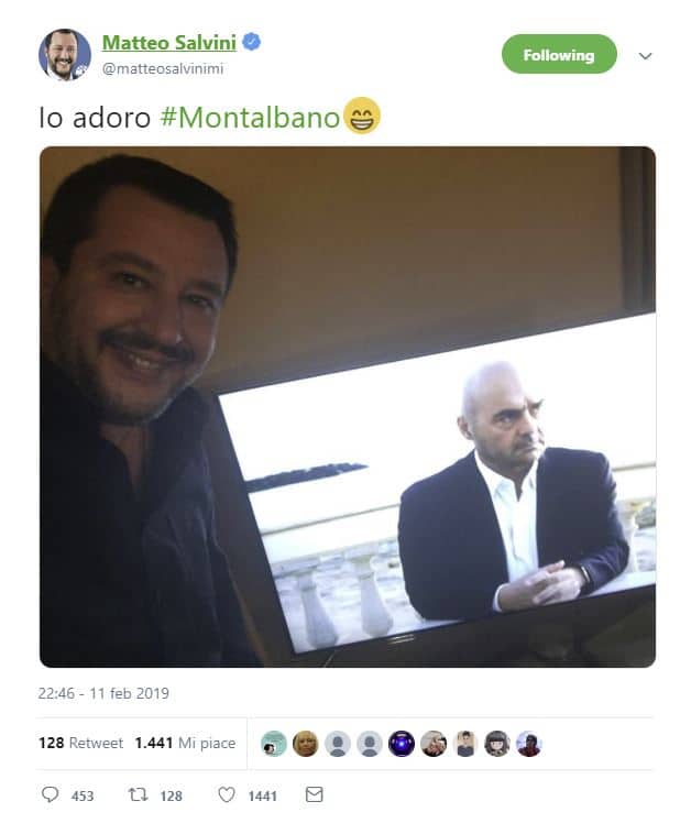 Il vicepremier, nel frattempo, ha deciso di twittare anche lui sull’argomento: “Io adoro Montalbano”, scrive a corredo di un selfie con la televisione. Un modo per smorzare le polemiche o per sottolineare la propria distanza dalle idee politiche del commissario di Rai 1?
