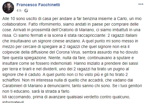 Facchinetti, attonito, descrive l’accaduto: “Due ragazzi italiani insultavano un signore cinese anziano. A quel punto mi sono messo in mezzo per cercare di spiegare ai due ragazzi che quel signore non era il colpevole della diffusione del Coronavirus, sembra assurdo ma ho dovuto fare questa spiegazione. Niente, nulla da fare, continuavano a sputare e insultare come se fossero indemoniati”.