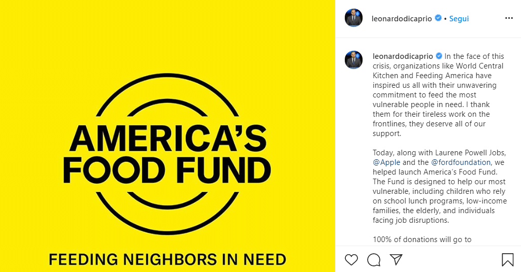 “Davanti a questa crisi, organizzazioni come World Central Kitchen e Feeding America ci hanno ispirati con il loro incrollabile impegno a nutrire le persone bisognose più vulnerabili”, ha scritto Leonardo DiCaprio in un post Instagram. “Li ringrazio per il loro instancabile lavoro in prima linea, meritano tutto il nostro supporto”.