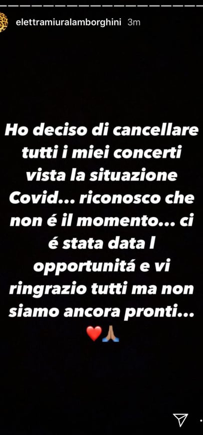 “Ho deciso di cancellare tutti i miei concerti vista la situazione Covid”. Lo annuncia su Instagram la cantante Elettra Lamborghini oggi, domenica 16 agosto. “Riconosco che non è il momento, ci è stata data l’opportunità, vi ringrazio tutti ma non siamo ancora pronti”, scrive in una storia sul social network.