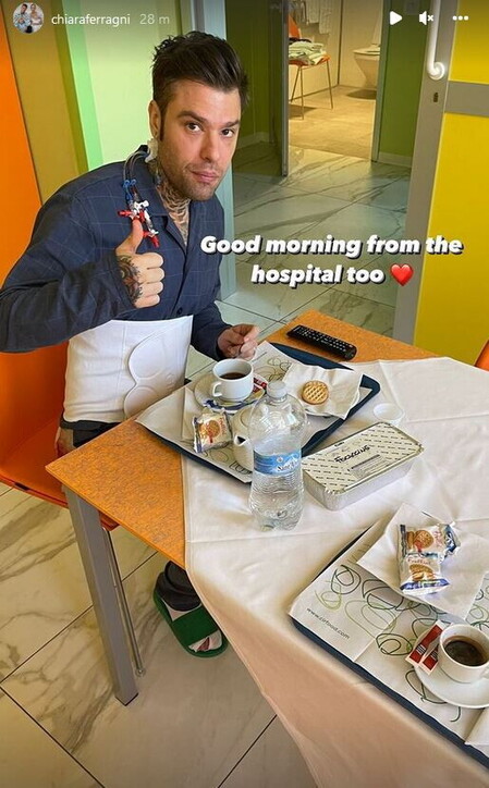 Prosegue bene la convalescenza di Fedez, dopo il delicato intervento a cui si è sottoposto martedì al San Raffaele di Milano per rimuovere un tumore neuroendocrino al pancreas. Circa una settimana fa il rapper aveva svelato con un video sui social di avere un problema di salute. Questa mattina la moglie Chiara Ferragni ha postato un’immagine dall’ospedale che riprende Fedez mentre fa colazione. Nello scatto il rapper, ancora ricoverato dopo l’operazione, alza il pollice in segno di ok. A corredo della foto la didascalia “Good morning from the hospital”, vale a dire “Buongiorno dall’ospedale”. Non è stato ancora annunciato quando il cantante potrà lasciare il San Raffaele per tornare a casa.