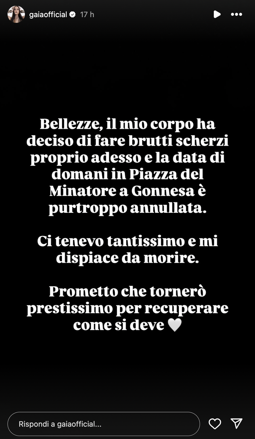 Gaia costretta ad annullare il concerto in Sardegna: “Il mio corpo ha deciso di fare brutti scherzi”