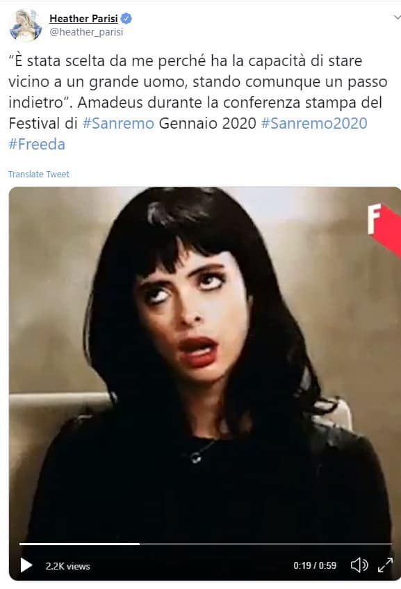 Tra chi ha preso di mira Amadeus sui social, anche la storica ballerina e soubrette Eather Parisi, che sul suo profilo Twitter condivide il video prodotto dal Freeda per sbeffeggiare le dichiarazioni al centro della polemica.