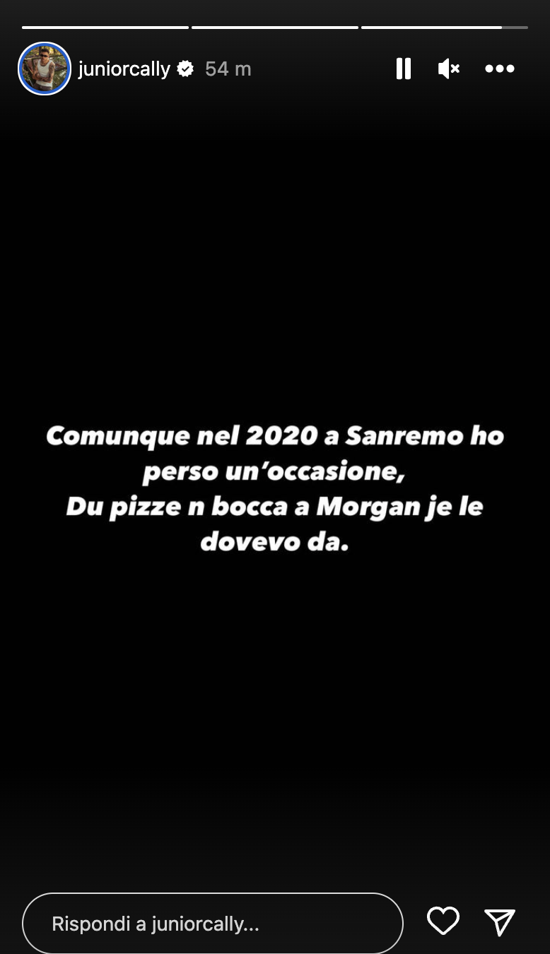 In una stories pubblicata sul suo profilo Instagram, infatti, il rapper ha scritto: “Comunque nel 2020 a Sanremo ho perso un’occasione. Du pizze in bocca a Morgan je le dovevo da”.