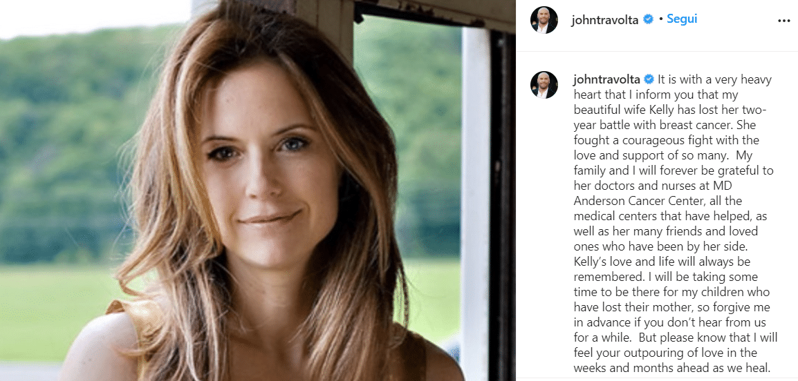 John Travolta ha perso sua moglie, Kelly Preston. La donna, 57 anni, era malata da tempo e lottava ormai da anni contro un tumore al seno. A dare la triste notizia è stato proprio l’attore via Instagram. “Con una pesantezza del cuore vi informo che la mia bellissima moglie Kelly ha perso la sua battaglia di due anni contro il cancro al seno. Ha combattuto con coraggio questa lotta, con l’amore e il sostegno di così tante persone. La mia famiglia ed io saremo sempre grati ai dottori ed infermieri del MD Anderson Cancer Center, tutti i centri medici che l’hanno aiutata, così come tutti gli amici e le persone care che sono state al suo fianco. Mi prenderò del tempo per essere presente per i miei figli che hanno perso la madre, quindi perdonatemi in anticipo se non sarò molto presente”.