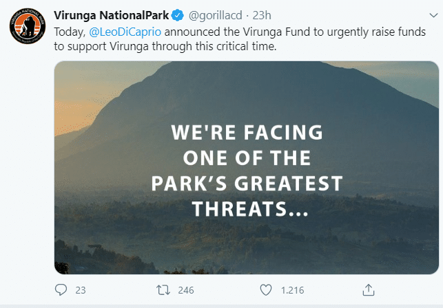 “Ho avuto il grande onore di incontrare e sostenere il coraggioso team di Virunga nella loro lotta contro le trivellazioni illegali nel 2013. Virunga ha bisogno urgente di fondi per proteggere la popolazione di gorilla in pericolo, di offrire sostegno ai ranger e alle famiglie di chi tra di loro ha perso la vita durante il lavoro, e per aiutare a offrire sforzi essenziali per impedire il contagio; è essenziale che uniamo le forze durante questo periodo all’insegna di una crisi incredibile”, ha spiegato DiCaprio.