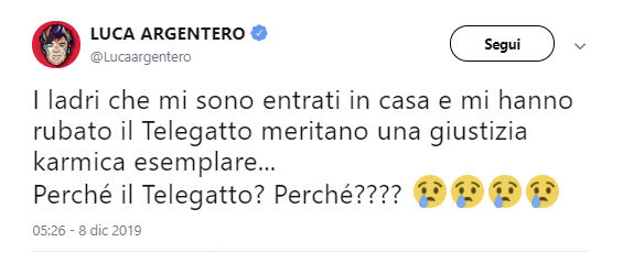A denunciare l’accaduto è stato proprio Luca Argentero via Twitter. “I ladri che mi sono entrati in casa e mi hanno rubato il Telegatto meritano una giustizia karmica esemplare. Perché il Telegatto? Perché?”.