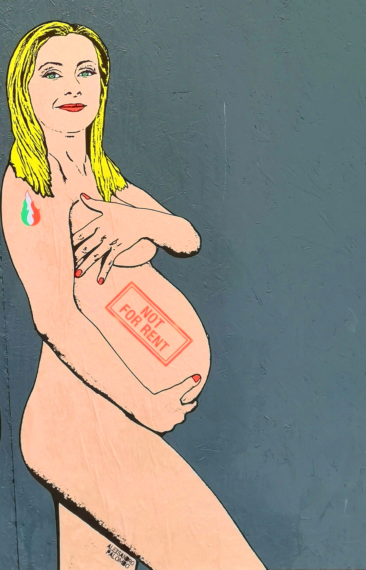 “Power is female”: la presidente del consiglio Giorgia Meloni e la segretaria del Pd Elly Schlein sono state immortalate dall’artista aleXsandro Palombo, che le ha ritratte spalla a spalla e incinte, nella nuova opera pop apparsa questa mattina, 22 maggio, nella centralissima Piazza San Babila a Milano per affrontare il tema della maternità surrogata. Le due leader si sfidano senza veli: sul grembo della Schlein appare la scritta “My uterus my choice” e su quello della Meloni “Not for rent”, con la fiamma tricolore e una bandiera arcobaleno tatuati sulle loro braccia.