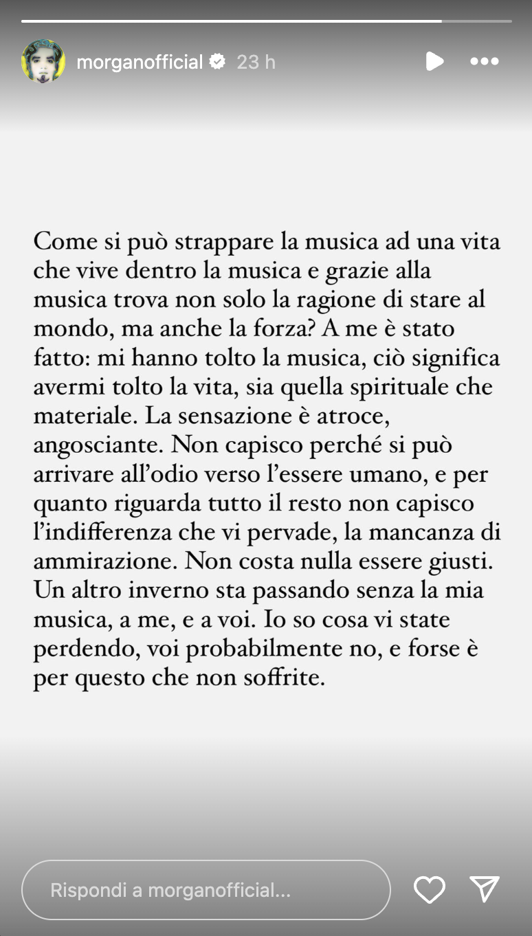 Morgan: “Mi hanno tolto la musica, ciò significa avermi tolto la vita”