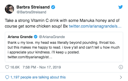 Barbra Streisand ha mandato un messaggio di supporto ad Ariana Grande su Twitter consigliandole “un beverone bello forte a base di vitamina C con un po’ di miele di Manuka e naturalmente una bella zuppa di pollo”.