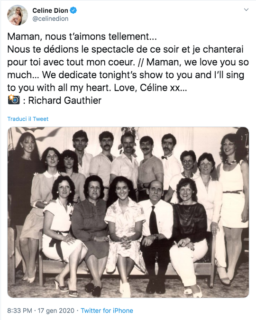 Un lutto ha colpito la famiglia di Celine Dion. A 92 anni è morta Therese Dion, madre della cantante canadese. “Mamma, ti amiamo così tanto…”, si legge in un tweet pubblicato ieri da Celine Dion insieme a una vecchia foto di famiglia in bianco e nero, che mostra ‘Maman Dion’ – così era soprannominata – con accanto suo marito e i loro 14 figli.