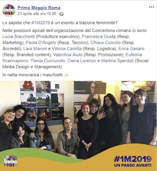 Piuttosto imbarazzante è stato anche il tentativo di porre rimedio alla evidente carenza di donne in piazza San Giovanni in prossimo primo maggio attraverso un post pubblicato sui social in cui compariva la foto dello staff che si muove dietro le quinte del grande palco, accompagnata dalla didascalia: “Lo sapete che il 1 maggio 2019 è un evento a trazione femminile?”.