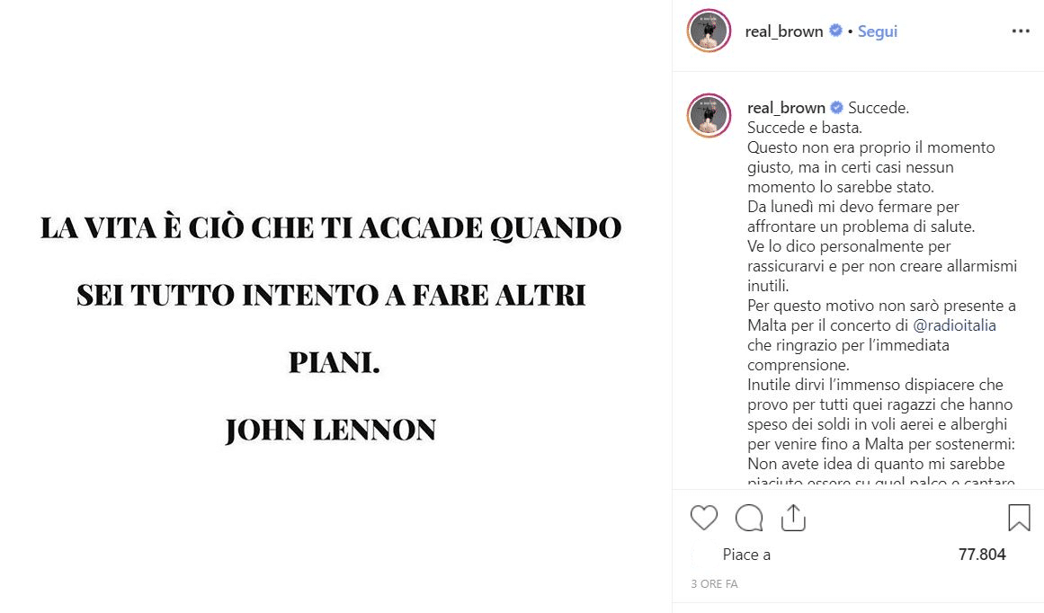 “Per questo motivo non sarò presente a Malta per il concerto di Radio Italia che ringrazio per l’immediata comprensione. Inutile dirvi l’immenso dispiacere che provo per tutti quei ragazzi che hanno speso dei soldi in voli aerei e alberghi per venire fino a Malta per sostenermi”, ha spiegato la 35enne leccese.