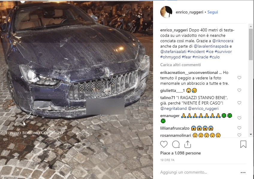 “Tutto sommato dopo 400 metri di testa coda su un viadotto, la macchina non è neanche messa così male. Evidentemente non era il momento. Grazie a Riccardo Nocera che era al volante e a qualcuno in alto che ha evitato che il guardrail cedesse”, ha scritto sulla sua bacheca Facebook Ruggeri accompagnando la foto della Maserati.