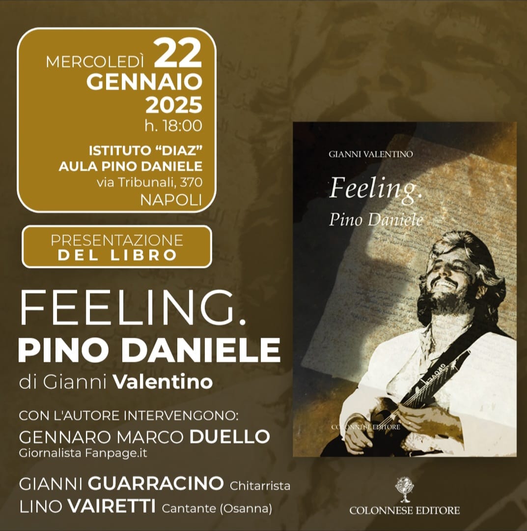 È arrivata il 17 gennaio in tutte le librerie italiane e sarà presentata ufficialmente domani, mercoledì 22 gennaio a Napoli, “FEELING. Pino Daniele” la nuova opera del giornalista, performer e autore Gianni Valentino, un racconto sonoro e appassionato, edito da Colonnese, che compone – attraverso 12 canzoni “indispensabili” (una per ogni mese dell’anno), – un particolarissimo jukebox, sorprendente e inedito mosaico della smisurata avventura creativa del musicista e cantautore napoletano scomparso dieci anni fa.