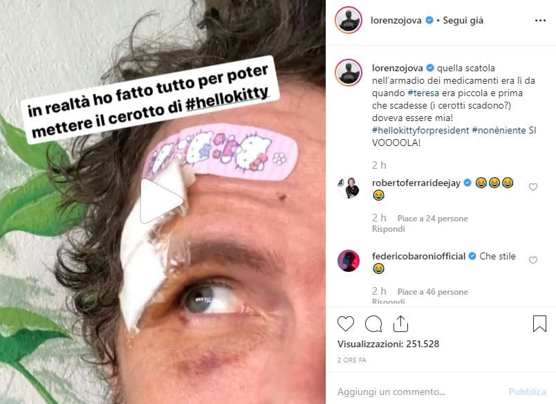 Oltre alla foto in cui si mostra malconcio, Jovanotti pubblica anche un altro post in cui appare con un simpatico cerotto di Hello Kitty. Ironico come sempre, il cantante scrive: “Quella scatola nell’armadio dei medicamenti era lì da quando Teresa (la figlia del cantante, ndr) era piccola e prima che scadesse (i cerotti scadono?) doveva essere mia!”. Insomma, Jovanotti ha fatto preoccupare i suoi fan, ma ancora una volta ha saputo condividere con leggerezza un momento della sua vita.