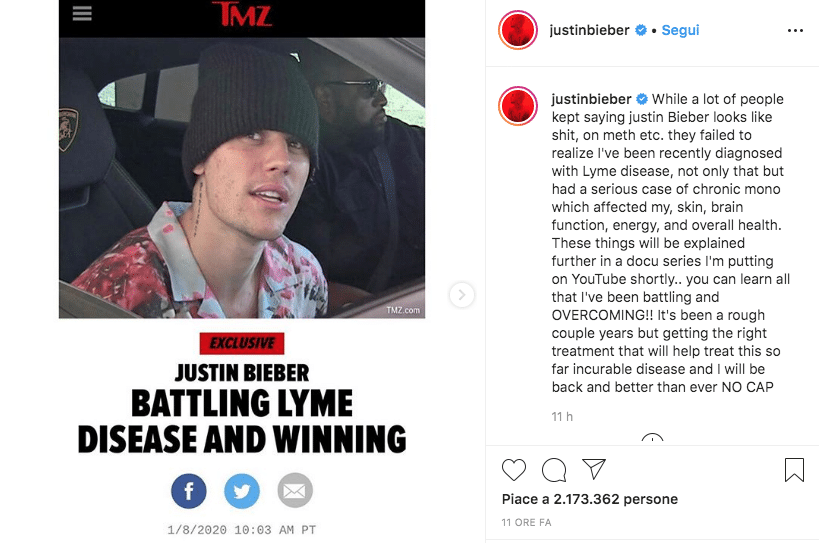 “Mentre molte persone dicevano che avevo un aspetto di merda, che mi facevo di metanfetamine , ecc., non si son resi conto che di recente mi è stata diagnosticata la malattia di Lyme, oltre che una grave mononucleosi cronica che ha colpito la mia pelle, le mie funzioni cerebrali, la mia energia e la mia salute in generale” ha scritto Bieber.