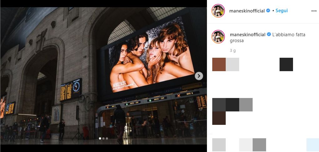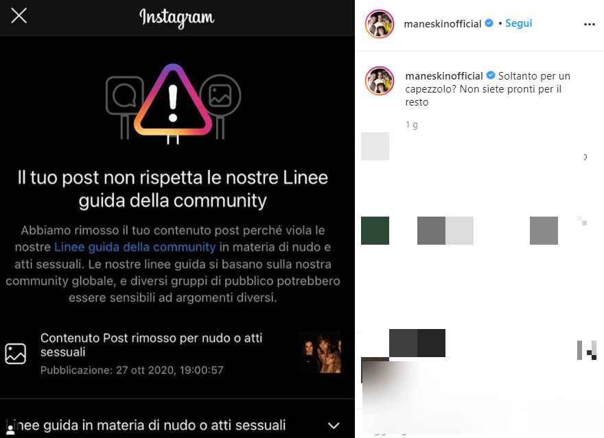 I Maneskin sono tornati con un nuovo singolo, Vent’anni, uscito proprio il 30 ottobre, (dopo due anni di silenzio) ma il nuovo poster non è piaciuto particolarmente ad Instagram, che ha applicato quasi tempestivamente la censura. La band, senza perdersi d’animo, ha poi condiviso un post su Instagram: “Soltanto per un capezzolo? Non siete pronti per il resto” si legge sul loro account, a corredo della foto che vede chiaramente espressa la censura del social newtork. “Contenuto post rimosso per nudo o atti sessuali”, si legge.