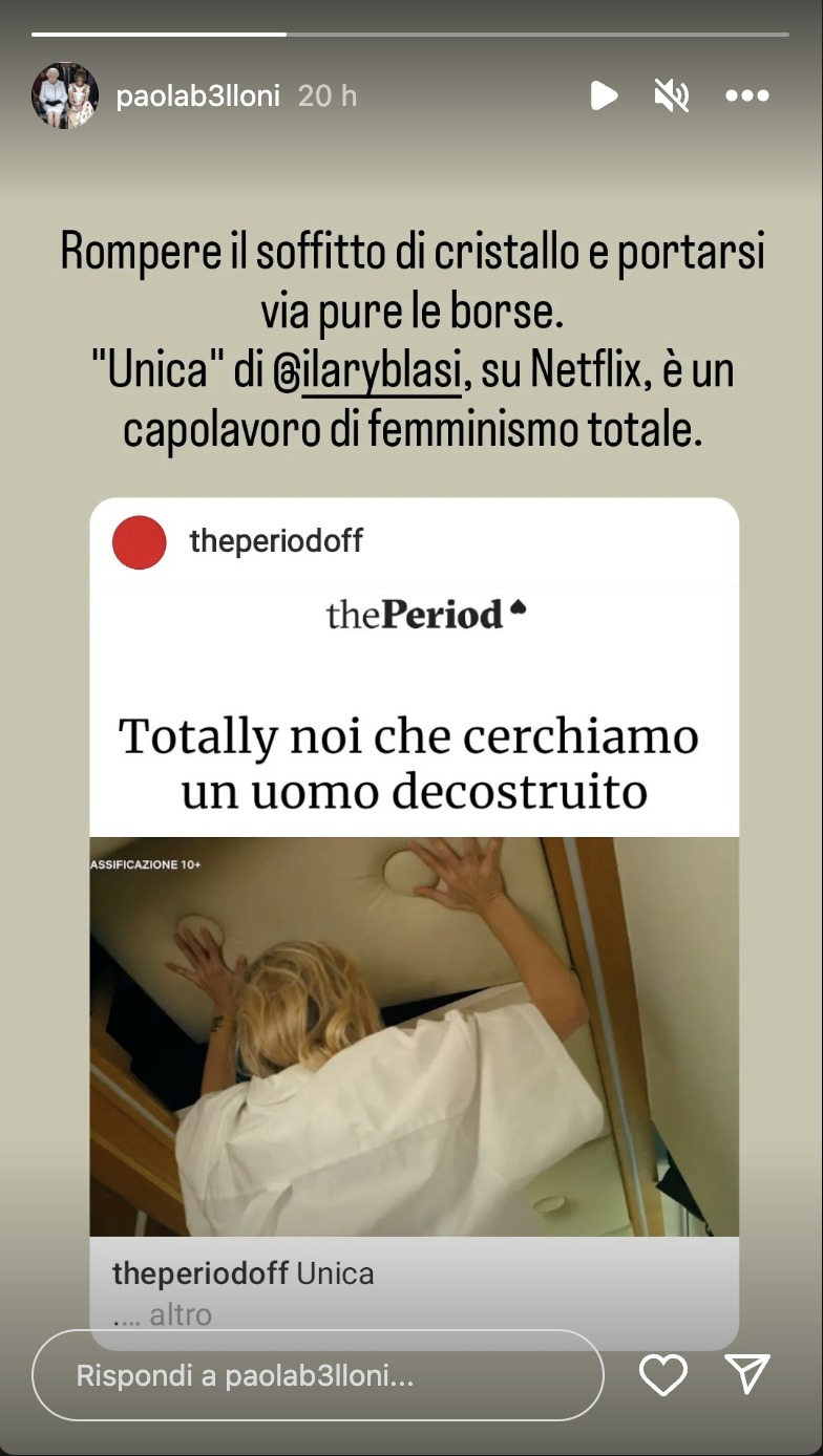 Sul suo profilo Instagram, infatti, Paola Belloni ha scritto: “Rompere il soffitto di cristallo e portarsi via pure le borse. Unica di Ilary Blasi su Netflix, è un capolavoro di femminismo totale”.