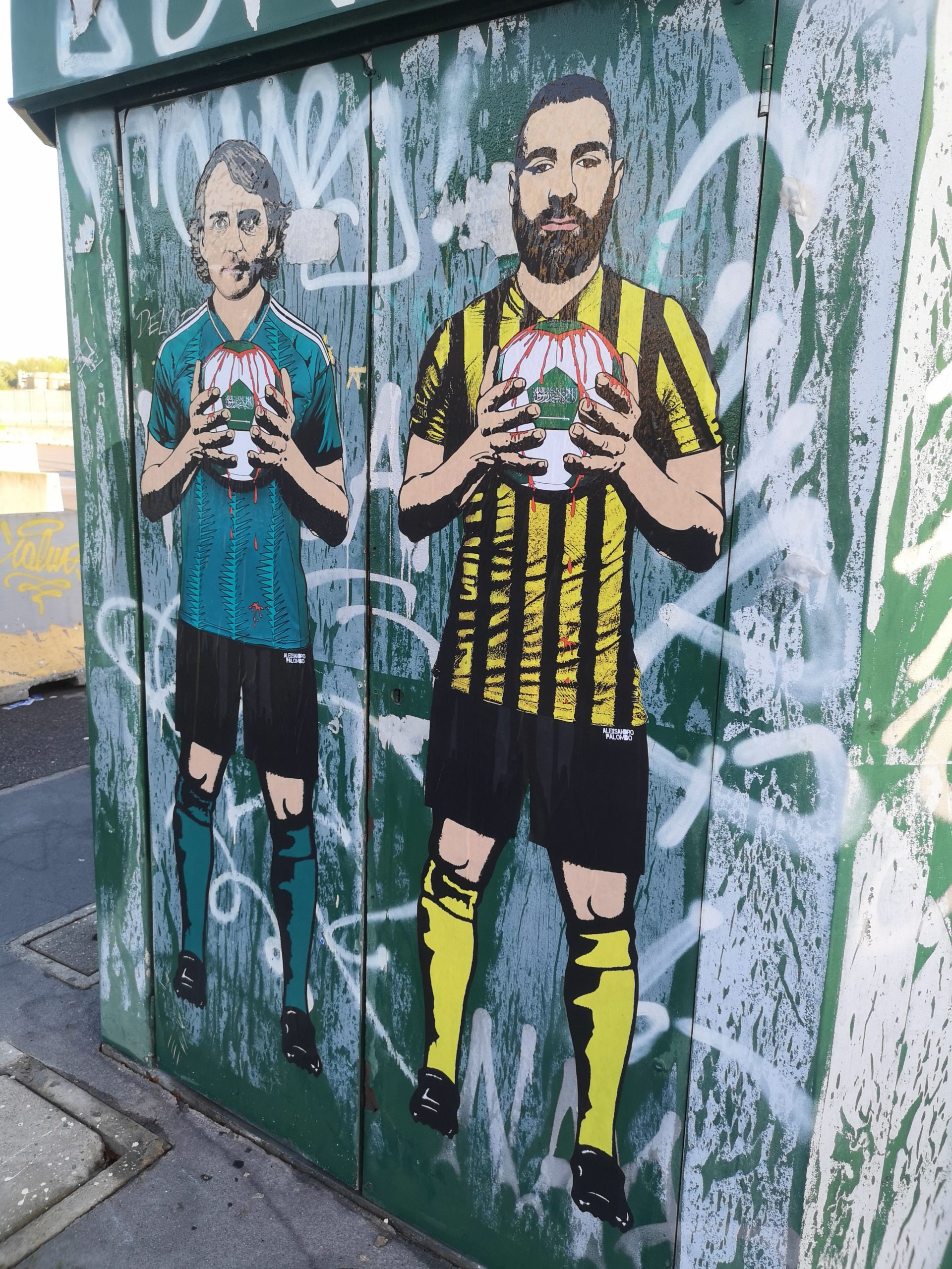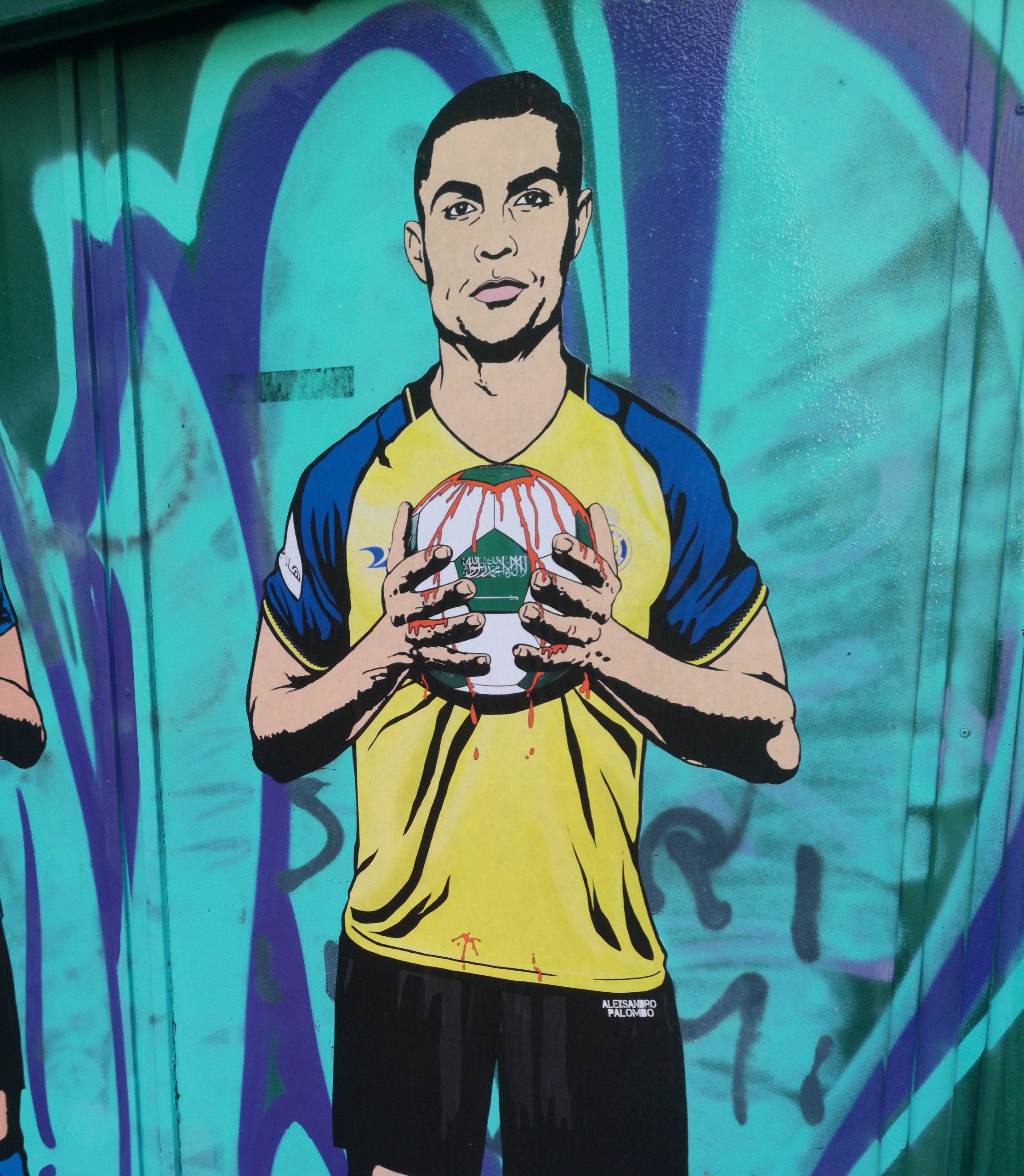 Roberto Mancini, il nuovo ct della nazionale dell’Arabia Saudita, è stato immortalato nella nuova serie di murales dell’artista aleXsandro Palombo apparsi questa mattina allo Stadio San Siro di Milano e in altri punti della città. Palombo ha realizzato delle opere di sensibilizzazione che ritraggono alcune star del calcio che hanno accettato le offerte stellari dell’Arabia – guidata dal regno di Mohammed bin Salman, dove la situazione sulla violazione dei diritti umani è molto grave – mentre stringono provocatoriamente un pallone insanguinato.