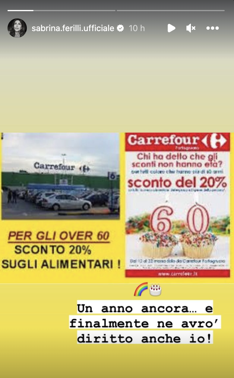 Tra le stories del suo profilo Instagram, infatti, l’interprete ha pubblicato la foto di due volantini di due noti supermercati, che propongono entrambi uno sconto del 20% per fare la spesa dedicato agli over 60.
