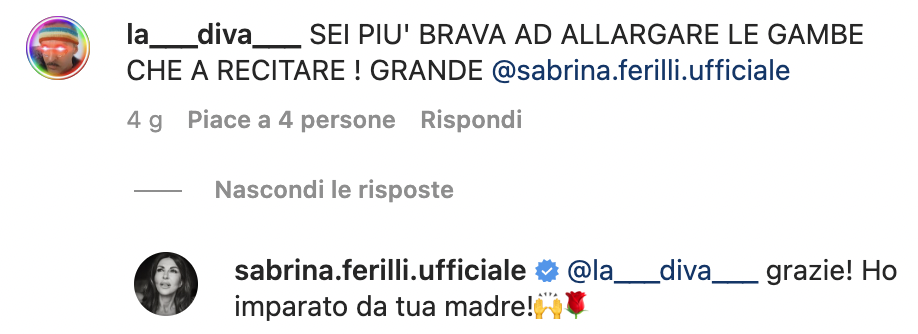 Tra i vari commenti ne è spuntato uno di un hater che ha scritto: “Sei più brava ad allargare le gambe che a recitare! Grande”.