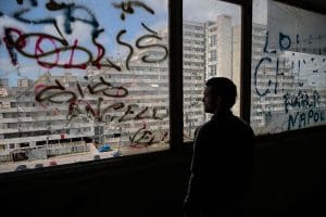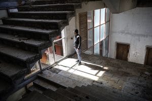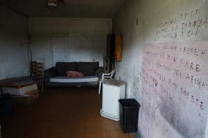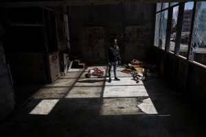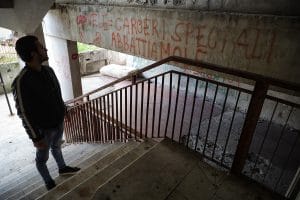 Riprendiamo il giro negli altri palazzi, sento un odore d’urina salire forte. Siamo al piano terra e percorriamo un corridoio molto stretto con alcune stanze alla nostra sinistra, sono tutte piene di spazzatura. Vediamo spuntare un topo che in un attimo sparisce tornando sotto la montagna di rifiuti. I conati arrivano presto, l’odore si fa sempre più forte e acido. Acceleriamo il passo tra le tante stanze, una identica all’altra e tutte piene di sporcizia. Quando stiamo per tornare indietro l’odore scema e troviamo qualcosa di inaspettato nella penultima stanza.