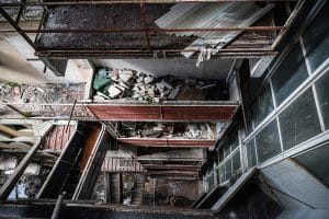 Proseguiamo il nostro giro, sono qua perché il progetto dell’abbattimento di questi edifici sta andando avanti e quella dove ci troviamo dovrebbe essere proprio la prima. Sentiamo dei colpi di martello all’ultimo piano. Ci arriviamo arrampicandoci dentro una piccola fessura al centro di una barriera costruita con pezzi di vecchi mobili e lamiere. Seguiamo il rumore, sono curioso di andare a chiedere agli operai che tempi ci sono per l’abbattimento e invece, quando arriviamo in cima, incontriamo due persone che stanno raccogliendo il ferro.
