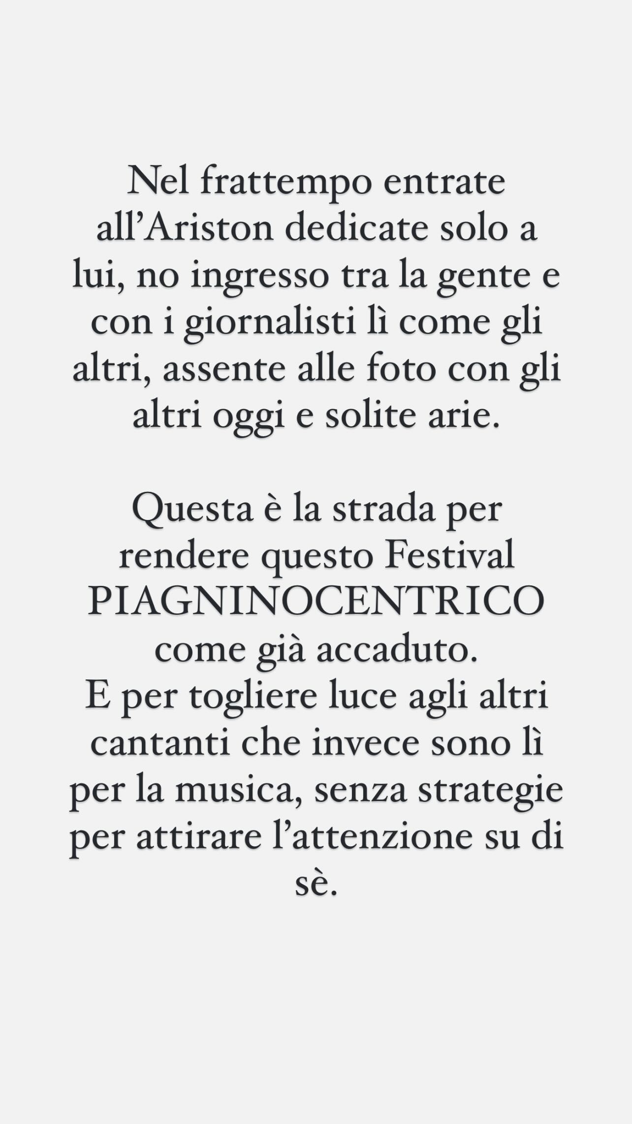 E ancora: “Questa è la strada per rendere questo Festival piagninocentrico come già accaduto. E per togliere luce agli altri cantanti che invece sono lì per la musica, senza strategie per attirare l’attenzione su di sé”.