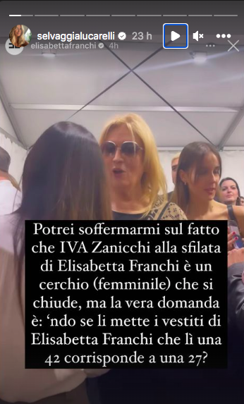 La giornalista ha condiviso un post della stilista Elisabetta Franchi, che ha ringraziato Iva Zanicchi per essere stata ospite alla sua sfilata in occasione della Milano Fashion Week. La stilista ha commentato con “Iva sei unica” una foto della cantante, ma la replica di Selvaggia Lucarelli è stata pungente.