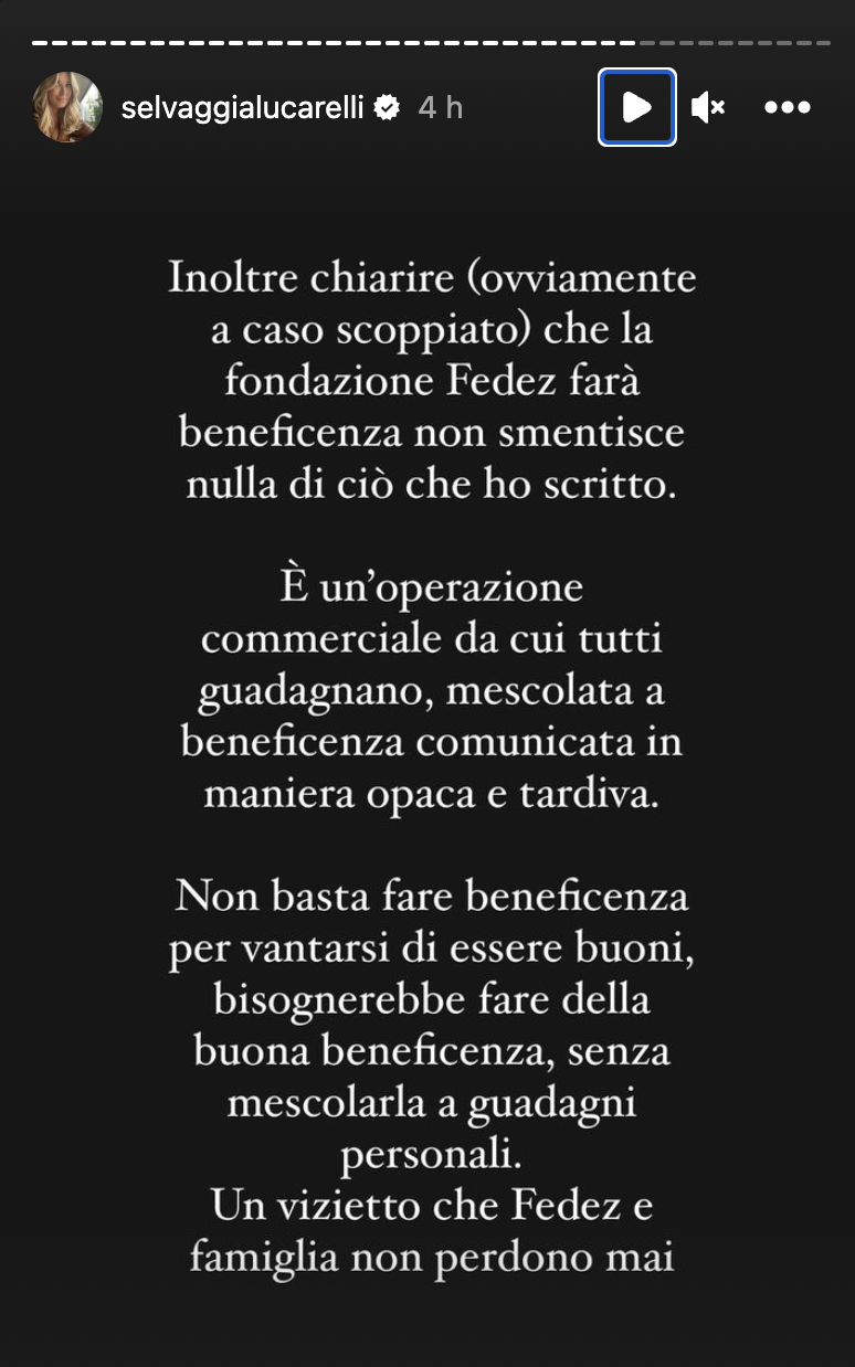 “Chiarire che la fondazione Fedez farà beneficenza non smentisce nulla di ciò che ho scritto. Non basta fare beneficenza per vantarsi di essere buoni, bisognerebbe fare della buona beneficenza, senza mescolarla a guadagni personali. Un vizietto che Fedez e famiglia non perdono mai”.
