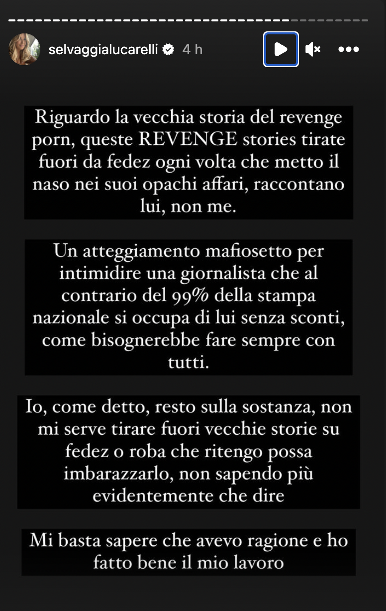 In una successiva stories, poi, Selvaggia Lucarelli ironizza: “Comunque rinnovate i dossier su di me, cominciano a essere un po’ datati”.