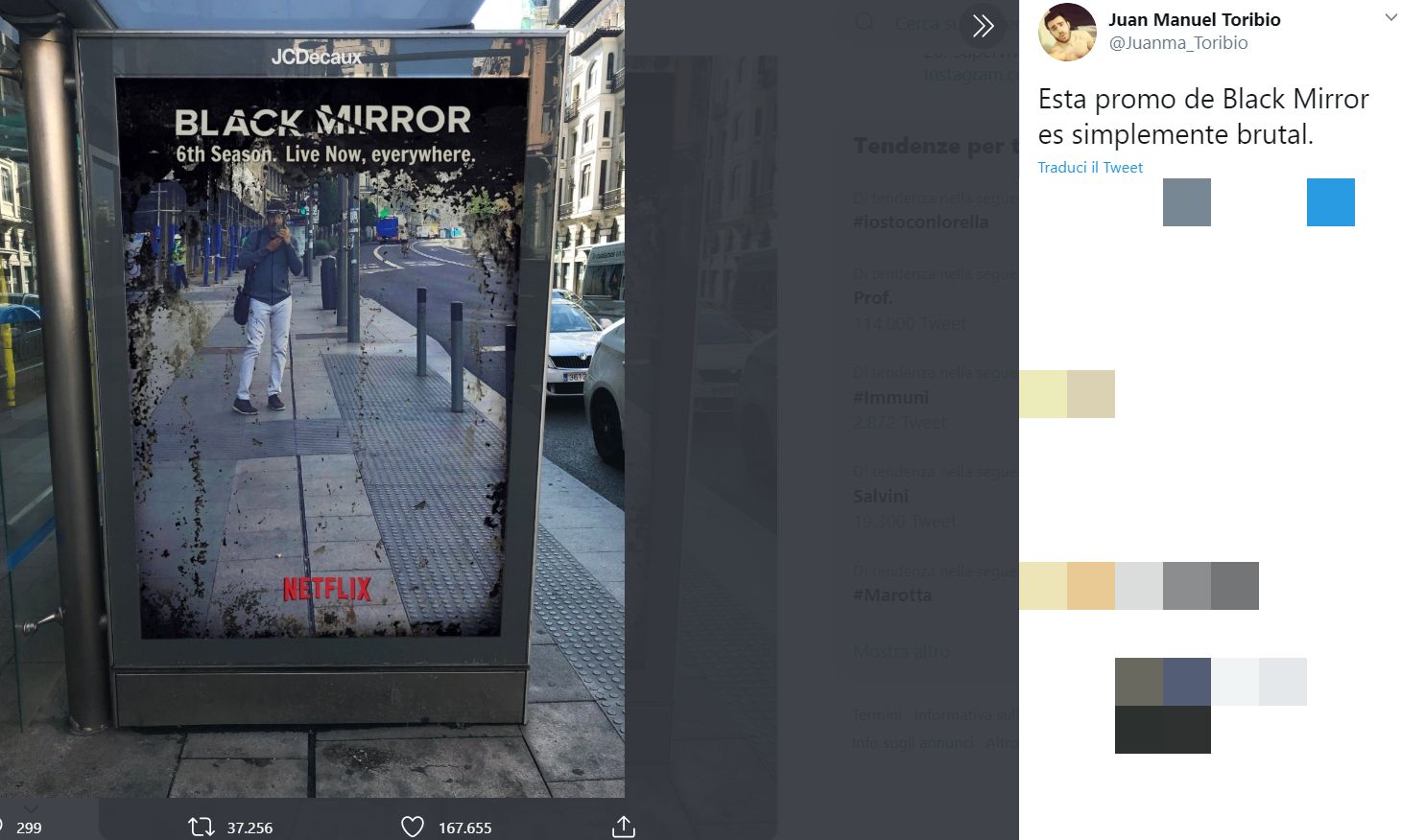 La sesta stagione di Black Mirror sta arrivando? Questa è la domanda che ha tormentato Twitter la scorsa settimana e tutto è stato causato da un bizzarro cartellone pubblicitario, apparso a Madrid: uno specchio attaccato a una pensilina degli autobus, in cui riflettere la propria immagine. La scritta in testa recita: “Black Mirror. Sesta Stagione. In diretta ora, ovunque”, in basso poi, ricalcata in rosso, la firma di Netflix. La verità è che il colosso dello streaming non c’entra proprio niente con questa nuova campagna pubblicitaria. L’idea è di quattro studenti della scuola pubblicitaria Brother Ad Madrid (Tito Rocha, Alberto Arribas, Rubén de Blas e Mer Mandrés), che hanno voluto realizzare un progetto scolastico interessante traendo spunto dalla tragica realtà.
