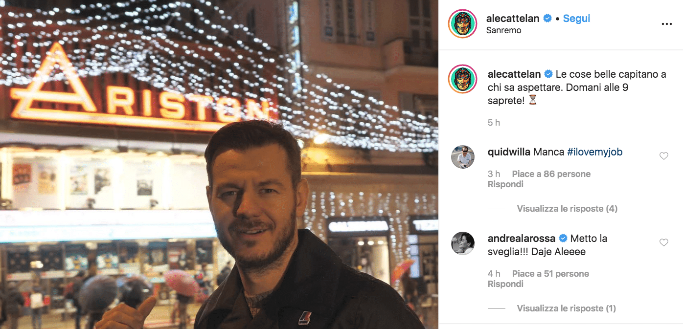 Alessandro Cattelan ha postato sul suo profilo Instagram una foto che lo ritrae davanti all’ingresso del Teatro Ariston. È “giallo”. Sui social è scoppiato il caso: il conduttore sarà ospite a Sanremo 2020? Cattelan è già pronto ad annunciare la conduzione del Festival di Sanremo 2021? O era solo di passaggio e ha pensato di scattarsi un selfie?