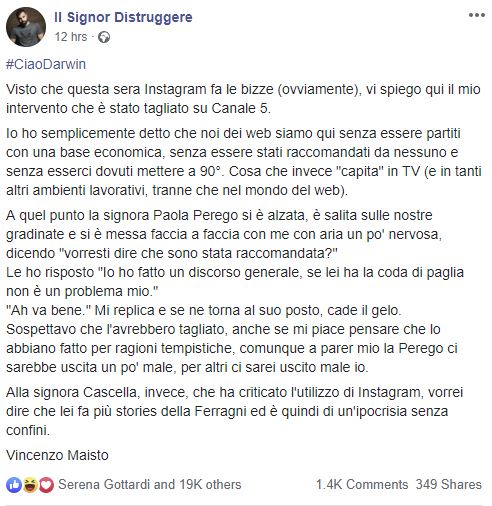 Promessa mantenuta, visto che in tarda serata di venerdì il Signor Distruggere ha svelato l’origine del battibecco con la Perego con un post su Facebook.