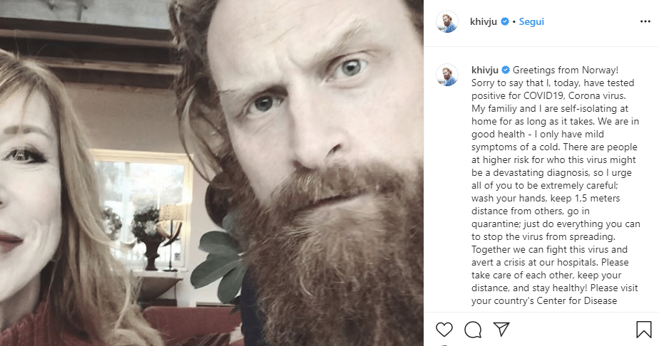 In un post pubblicato su Instagram di lunedì 16 marzo, l’attore norvegese ha spiegato di aver fatto il tampone, risultato poi positivo al Covid-19. Come poi spiegato da Hivju, l’attore era già in auto-quarantena insieme alla sua famiglia. “Mi spiace dire che oggi sono risultato positivo al Covid19, al Coronavirus. Io e la mia figlia siamo in isolamento e in auto-quarantena. Stiamo tutti bene in salute, io ho solo i normali sintomi di un raffreddore. Ci sono persone d alto rischio con diagnosi devastanti, per questo dovete stare tutti molto attenti”. Di qui, partono le classiche istruzioni per prevenire il contagio da Coronavirus: “Lavate le mani, tenete le persone almeno a un metro e mezzo di distanza, restate in quarantena, fate tutto quello che è in vostro potere per permettere al virus di non svilupparsi. Insieme possiamo combattere il virus ed aiutare le crisi nei nostri ospedali. Vi prego di tenere cura di voi stessi, gli uni con gli altri, mantenete le distanze e restate in salute”.