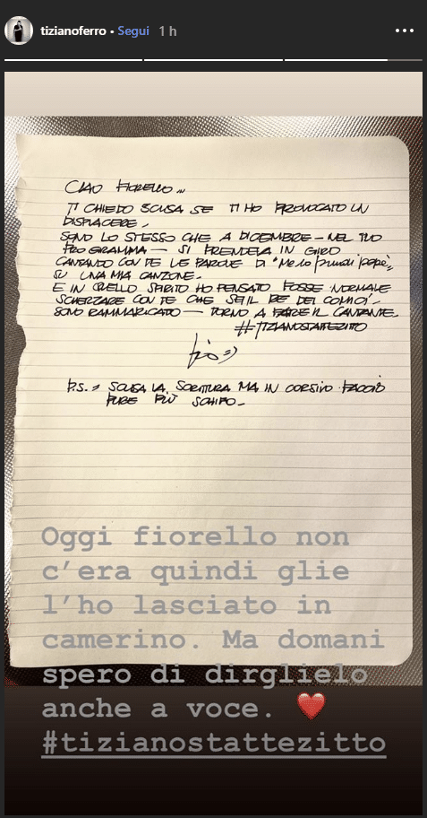 Sempre ieri, ma poco prima della terza serata del Festival a cui Fiorello non ha (come da programma) preso parte, è poi arrivato un messaggio di scuse da parte di Tiziano Ferro tramite Instagram dove ha postato una foto di un biglietto scritto a mano: “Ciao Fiorello, ti chiedo scusa se ti ho provocato un dispiacere. Sono lo stesso che a dicembre – nel tuo programma – si prendeva in giro cantando con te le parole di “Me lo prendi papà” su una mia canzone. E in quello spirito ho pensato fosse normale scherzare con te che sei il re dei comici. Sono rammaricato, torno a fare il cantante. Scusa la scrittura, ma in corsivo faccio pure più schifo”.